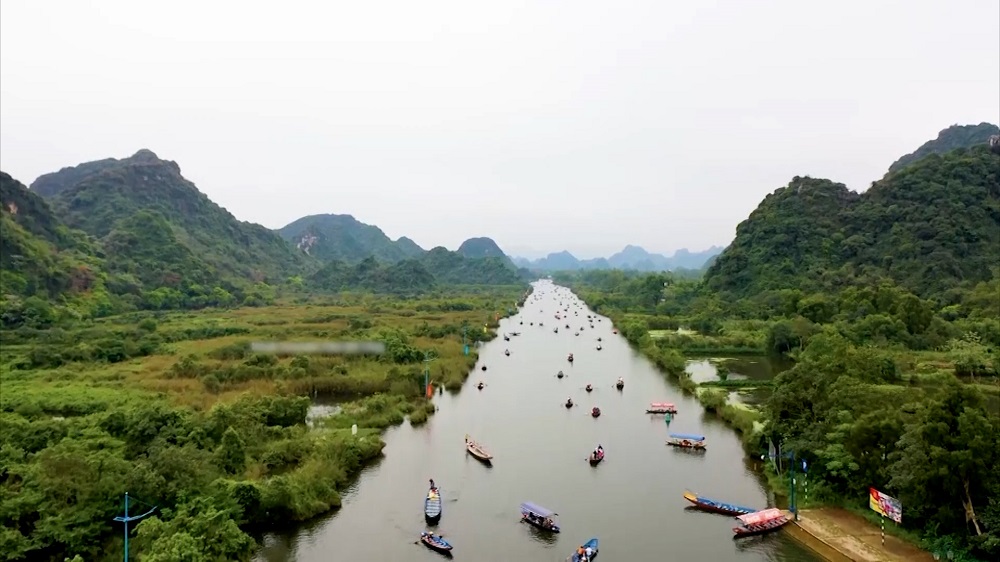 Sitting on the boat, looking out into the distance, a few thin mists still lingered on the cliffs, flocks of birds flying high above, and the pagoda roof was faintly hidden behind the bushes. All blend together, creating a scene that is both sacred and lyrical.